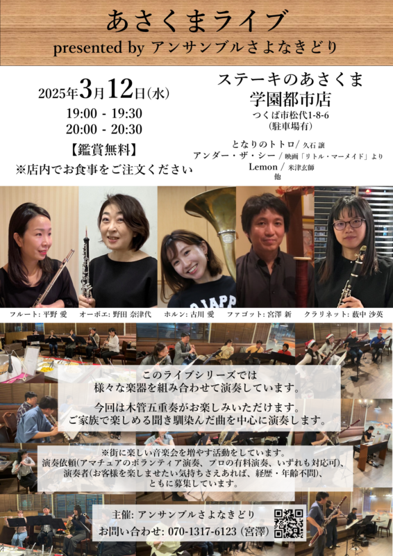 大人の方でも楽器経験者の方、ご本人でなくてもお知り合いにそういう方がいらっしゃったら、ぜひ一緒に演奏しませんか。