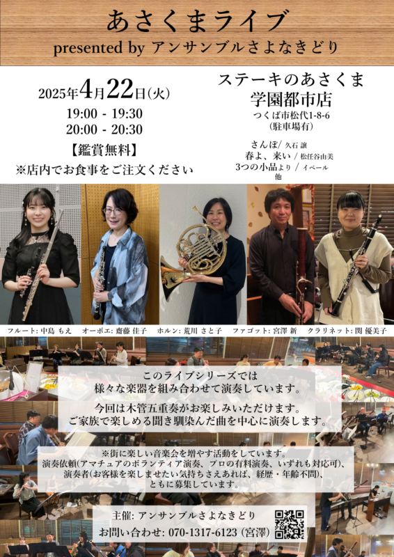 「アンサンブルさよなきどり」では、楽器経験者の方にサポートと演奏の場を提供して、