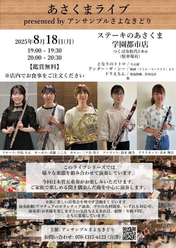 大人の方でも楽器経験者の方、ご本人でなくてもお知り合いにそういう方がいらっしゃったら、ぜひ一緒に演奏しませんか。