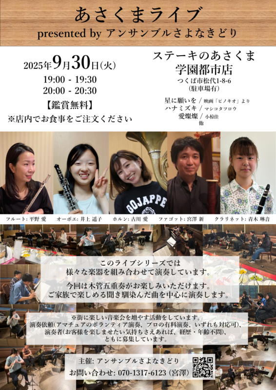 大人の方でも楽器経験者の方、ご本人でなくてもお知り合いにそういう方がいらっしゃったら、ぜひ一緒に演奏しませんか。