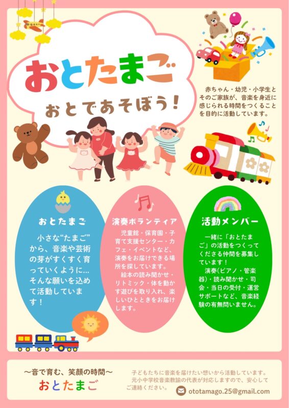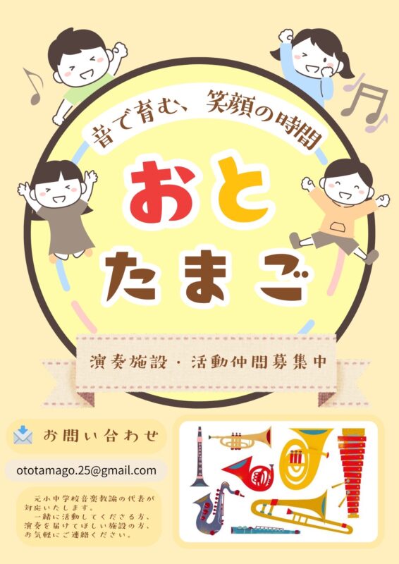 子供向け演奏のユニット「おとたまご」の活動を開始しました。 児童館・保育園・子育て支援センター・カフェ・イベントなどで、ボランティア演奏を行います。お気軽にご依頼ください。 元小中学校教諭の代表が対応しますので、安心してご連絡ください。 ※一緒に演奏する仲間も募集しています。特に平日昼間に演奏できるメンバー歓迎です。