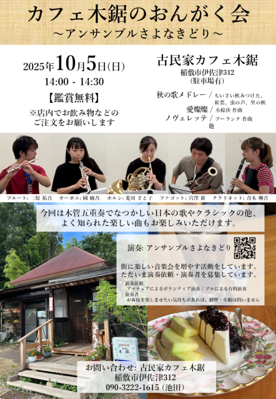 稲敷の古民家カフェ木鋸さんで木管五重奏の演奏をしました。
